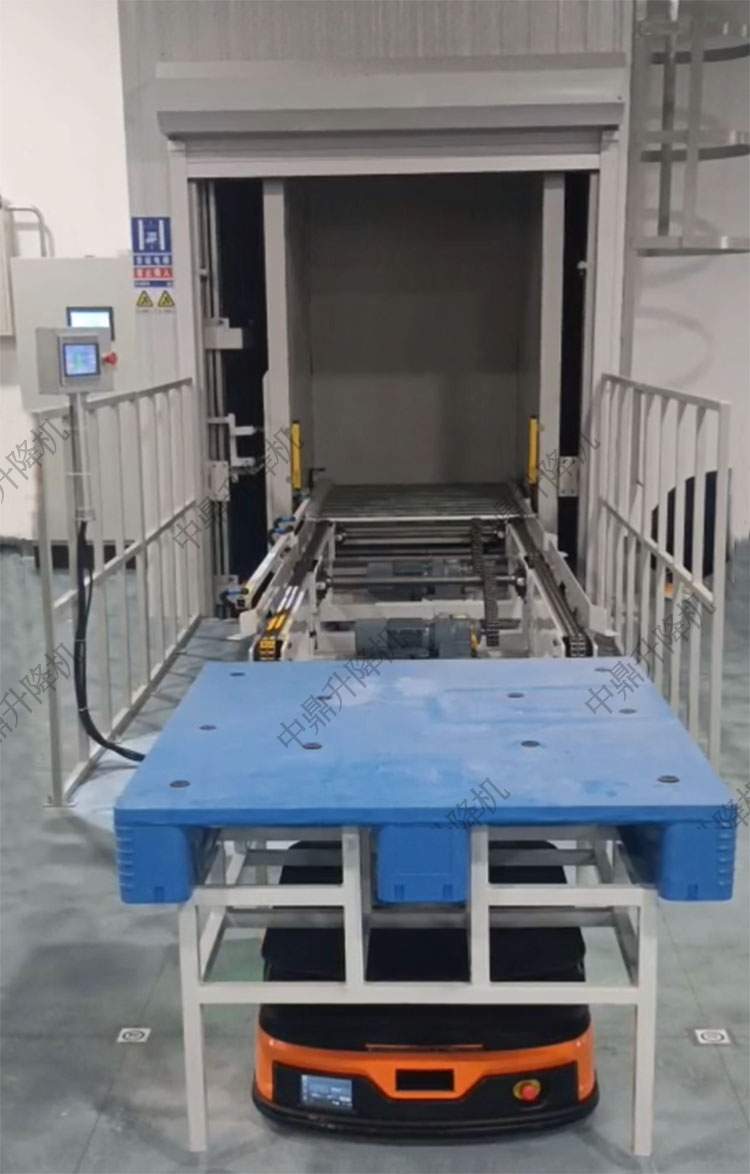 2. 仓储物流:在自动化立体仓库中,货物需要频繁地在不同楼层的存储区域与分拣区域之间转移。AGV对接往复式提升机能够实现货物的自动出入库与楼层间转运,与仓储管理系统(WMS)紧密配合,提高仓储空间利用率,加快货物周转速度 ,提升仓储物流的智能化水平。