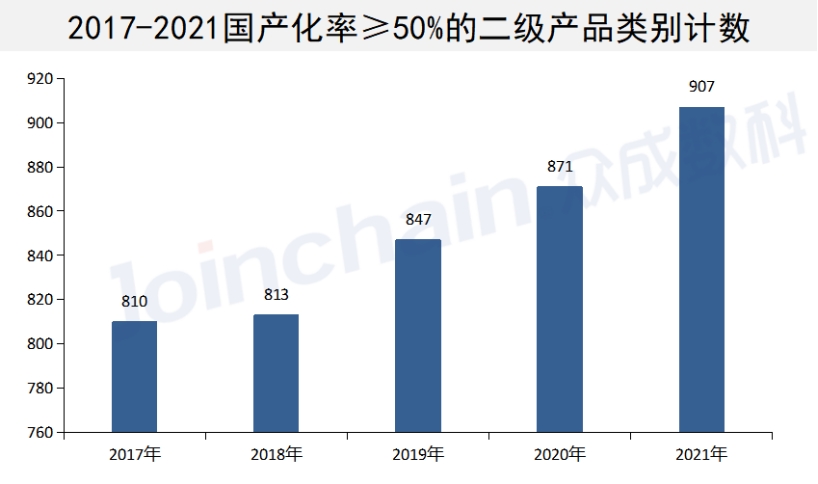 截至2021年底,国内可分类的1083项二级品类中,国产化率为0%的二级产品类别共52项,国产化率为0-40%的二级产品类别共88项,国产化率为40-70%的二级产品类别共215项,国产化率70%以上的二级产品类别共728项。