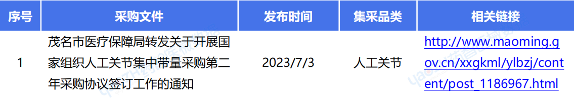 2023年第三季度,药智医械数据收集到国家集采相关通知1次,相关数据4126条,涉及产品为人工关节。
